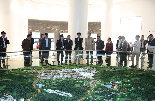 張建國(中)參觀園區(qū)沙盤,了解項目規(guī)劃布局及產(chǎn)業(yè)創(chuàng)新相關情況,