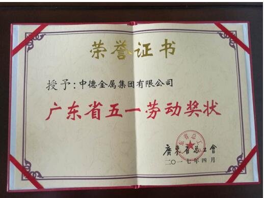 中德金屬集團(tuán)“廣東省五一勞動獎狀”榮譽(yù)證書