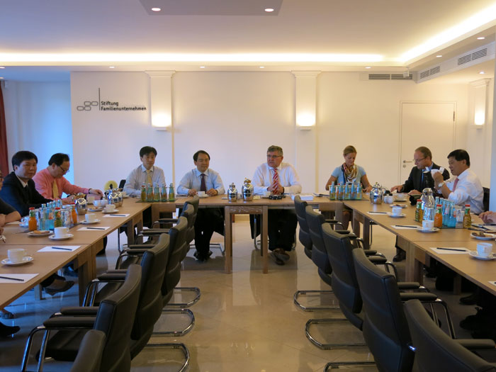 揭陽市經(jīng)貿(mào)代表團(tuán)與德國家族企業(yè)基金會執(zhí)行主席施耐德(右四)、德國金屬企業(yè)聯(lián)合會負(fù)責(zé)人哈德勒(右三)座談