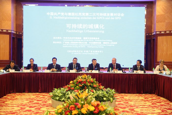 8月27日上午,由中共中央對(duì)外聯(lián)絡(luò)部、德國艾伯特基金會(huì)主辦的中德兩黨第二次可持續(xù)發(fā)展對(duì)話會(huì)在揭成功召開。來自中國共產(chǎn)黨和德國社會(huì)民主黨有關(guān)代表、專家和企業(yè)家共100多人參加了對(duì)話會(huì)。
