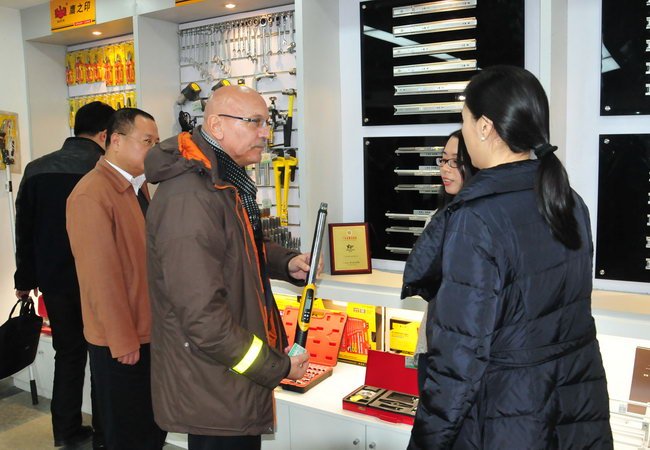 施泰格參觀金屬制品展廳的推介產(chǎn)品,聽(tīng)取揭陽(yáng)先進(jìn)企業(yè)的發(fā)展情況介紹