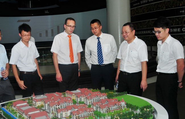 韋寶良(右二)一行參觀中德金屬生態(tài)城營(yíng)銷展廳,了解項(xiàng)目發(fā)展歷程及與德合作情況