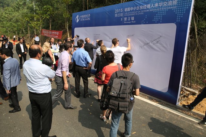 通過實地考察和聽取情況介紹,德國中小企業(yè)經(jīng)理人對中德金屬生態(tài)城表現(xiàn)出濃厚興趣。在開班儀式后,他們來到了中德金屬生態(tài)城萬畝森林公園植下中德友誼之樹,并在留言墻上寫下寄語。MAE中德咨詢公司執(zhí)行董事馬恩工工整整地寫下“中德合作共贏”六個漢字,而CNGE國際咨詢責任有限公司首席執(zhí)行官托馬斯。諾爾廷則用“非常好”的拼音表達了他對中德金屬生態(tài)城的印象!拔覀儠僖姷模谊!”留言墻上記錄了德國中小企業(yè)經(jīng)理人的熱切期待和美好愿景。