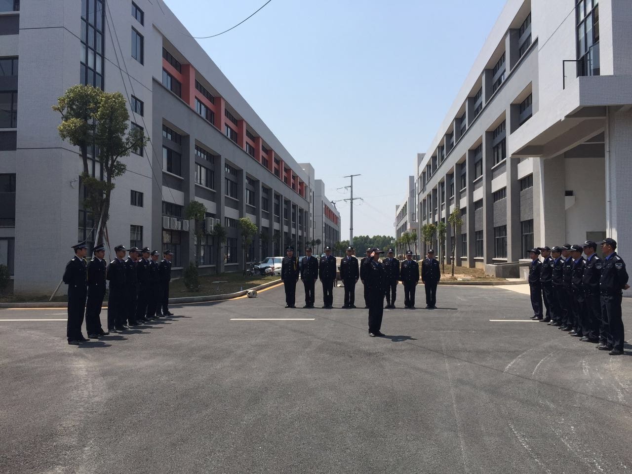 物業(yè)公司保安團隊在消防演習前進行出操訓練